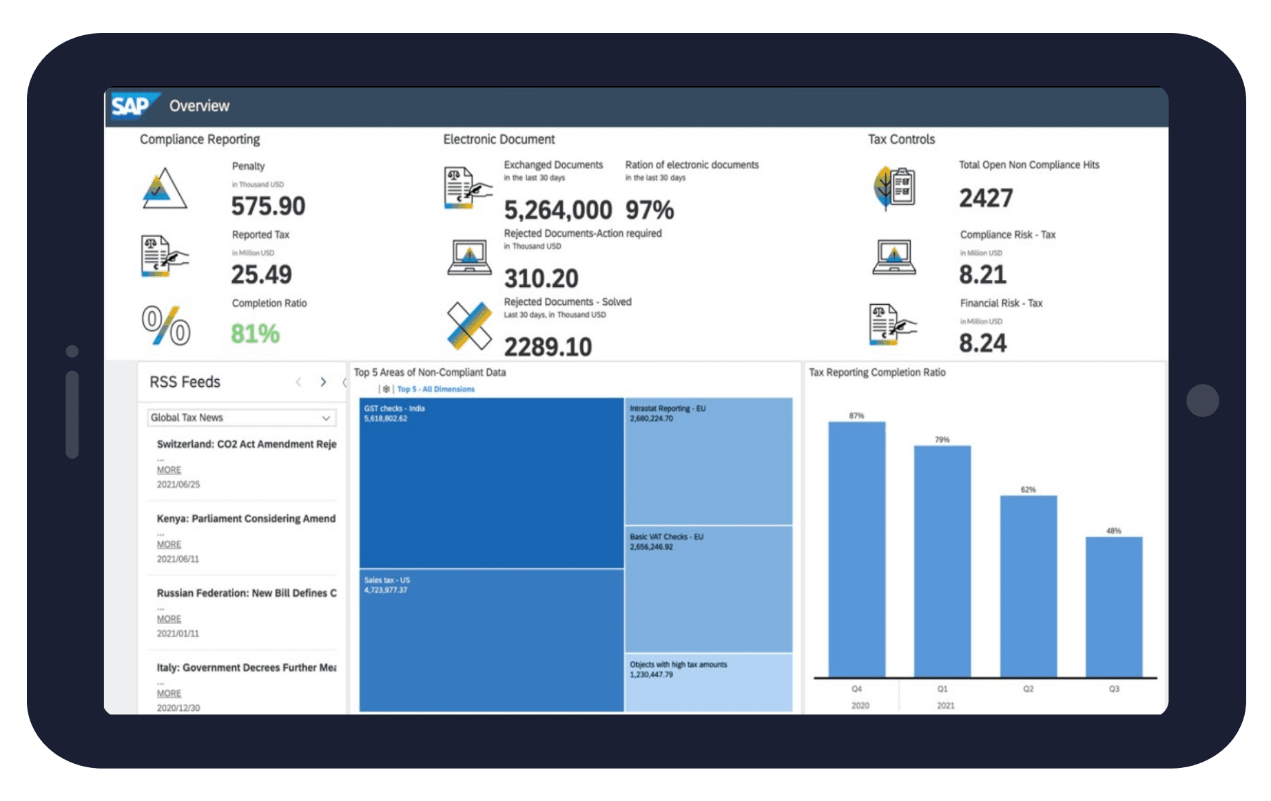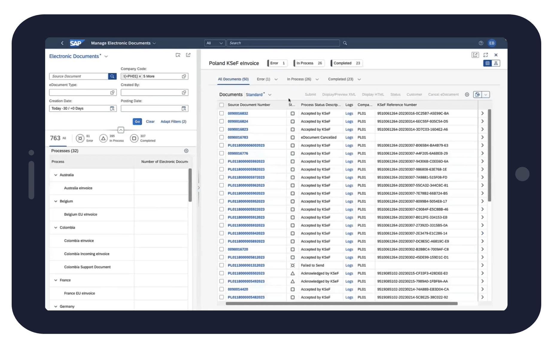 SAP DRC facilite le rapprochement entre les enregistrements internes et les enregistrements disponibles sur les plateformes des autorités fiscales. Il offre un cadre de contrôle de la cohérence unique pour automatiser les vérifications, examiner les incohérences de manière centralisée et lancer les corrections, avec la possibilité d’identifier les incohérences et de rationaliser la remédiation. En outre, SAP DRC identifie les enregistrements manquants avant la fin de la période et vérifie automatiquement les projets de déclaration préparés par les autorités et les accepte ou les rejette pour finaliser la soumission périodique.